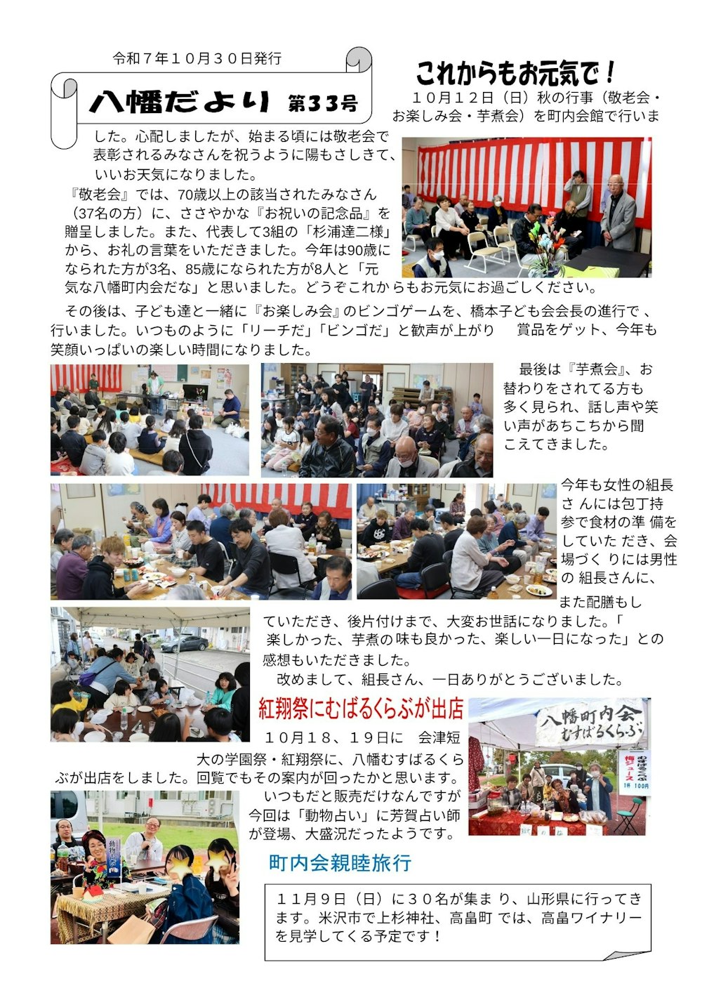 第33号「八幡だより」が発行されました!敬老会の様子や会津短大の学園祭「紅翔祭」に出店したときの様子が掲載されています。11月も「町内会親睦旅行」等、様々なイベントが開催されます。ぜひ今月分もご覧ください!
