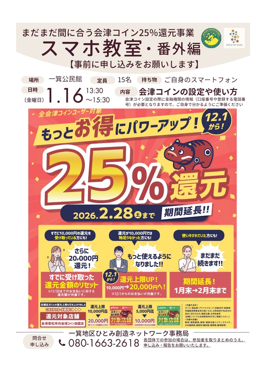 📱 持ち物:ご自身のスマートフォン ※会津コイン教室に参加される方は、金融機関の情報(口座番号など)がわかるものをお持ちください。