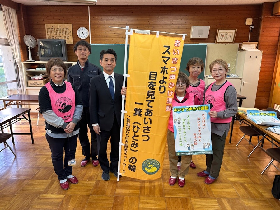 今回のスローガンは「スマホより 目を見てあいさつ 一箕(ひとみ)の輪」と「さりげない あいさつでつなぐ 地域の輪」です。