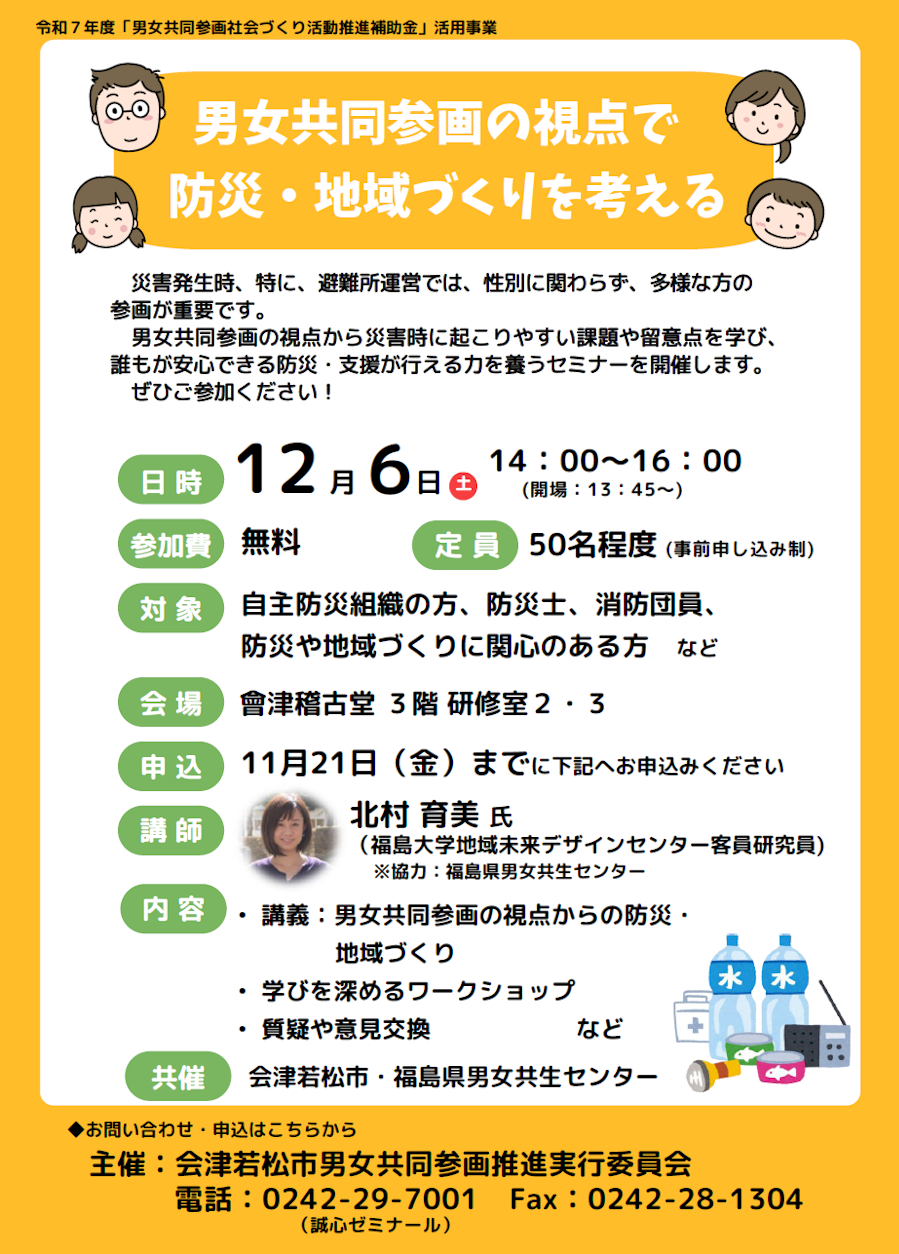 会津若松市男女共同参画推進実行委員会主催で、防災・地域づくりに関するセミナーが開催されます。
